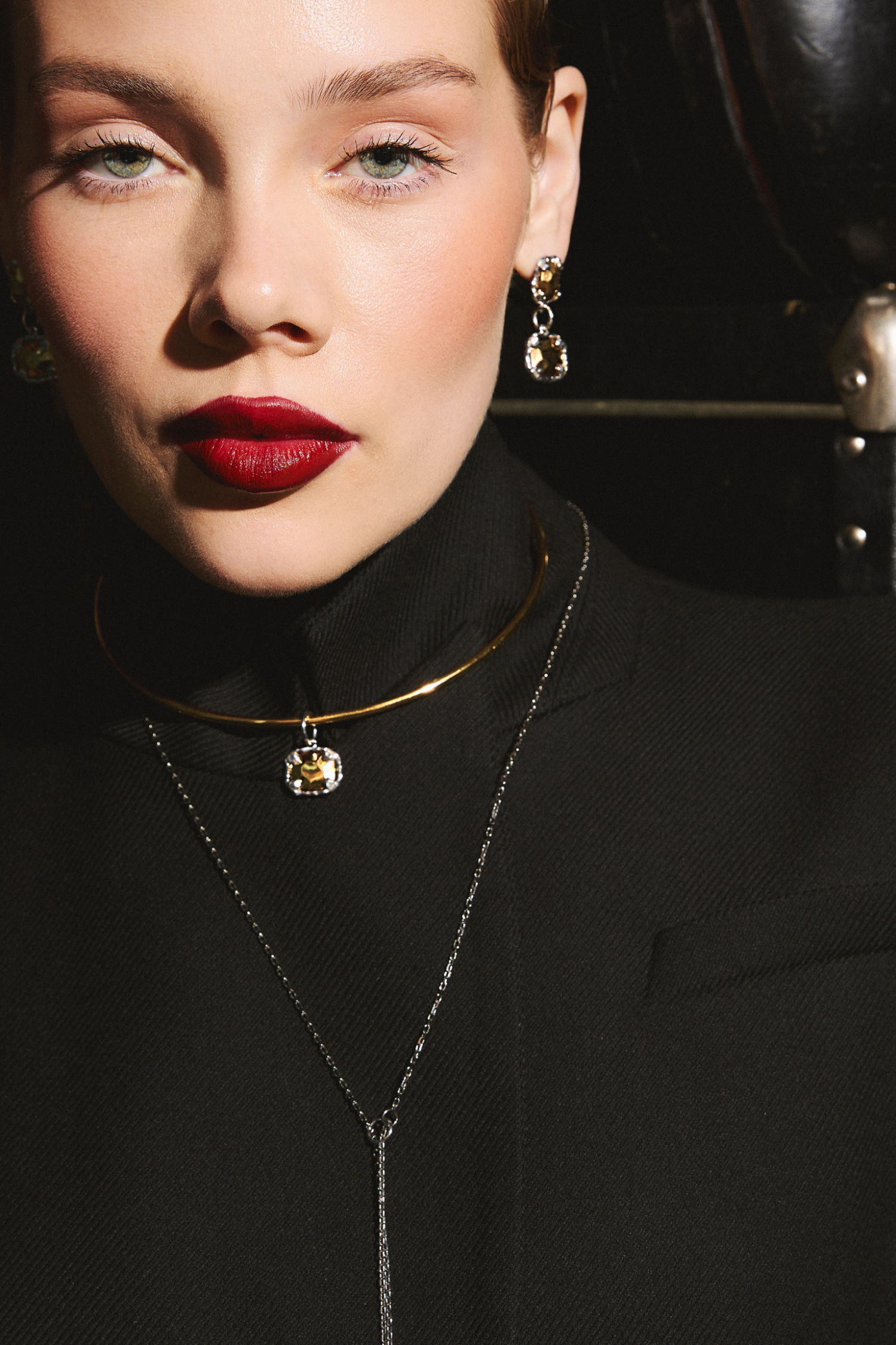 Ключевой элемент коллекции — огранённая геометрическая форма из металла, отсылающая к театральной загадочности и притягательности сцены. Чёрный родий создаёт глубокий, почти ночной оттенок, а тёплый золотой цвет вспыхивает, как свет софитов. Кисточки из цепей добавляют динамику и выразительность движениям, превращая жесты в маленькие сценические акты.