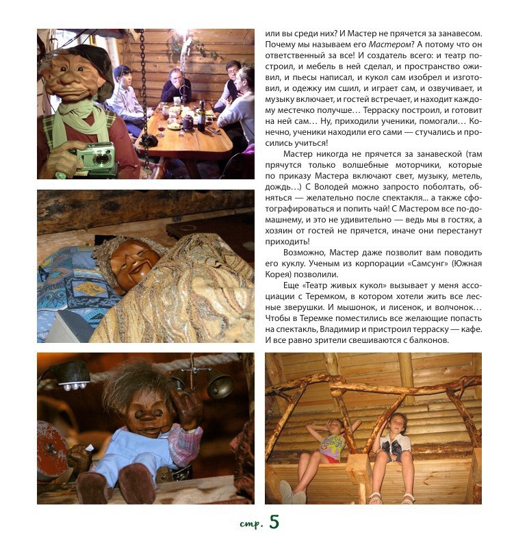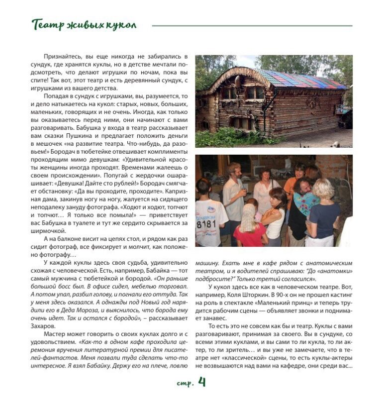 Например, в книге можно прочитать интервью Ирины Масловской (Гринберг), которая вместе с Владимиром Захаровым занималась строительством театра «2+КУ». Или интервью с немецкой студенткой Рамоной Гастль, которая в последние годы жизни Владимир Захарова сняла на видео все его спектакли и впоследствии создала короткометражный фильм о томском кукольнике.