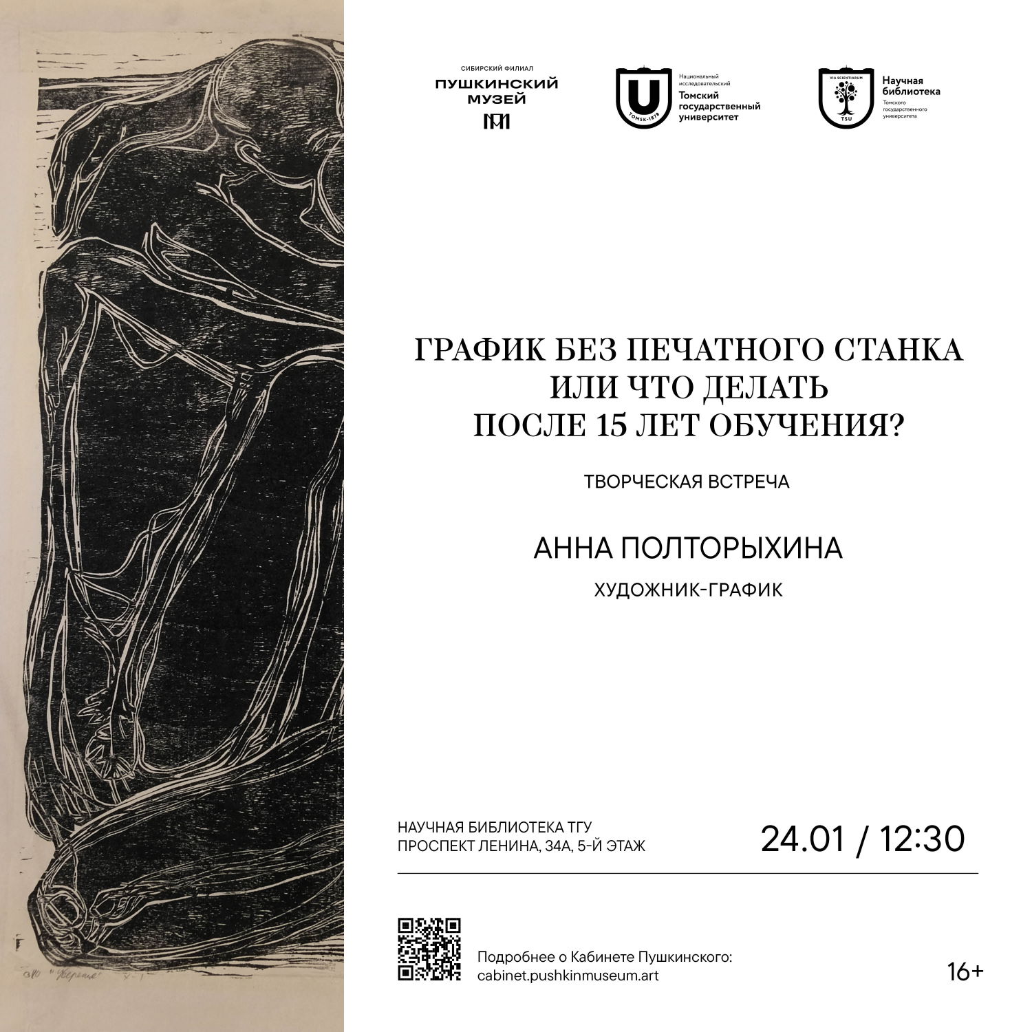 На следующий день, 24 января, пройдет творческая встреча с Анной Полторыхиной «График без печатного станка или что делать после 15 лет обучения?». Она расскажет о годах обучения в Красноярске и последующем возвращении в Барнаул. Особенно интересны ее опыт как художника-графика в условиях отсутствия печатного станка, а также история о вынужденном, но плодотворном переходе к работе цветным карандашом.