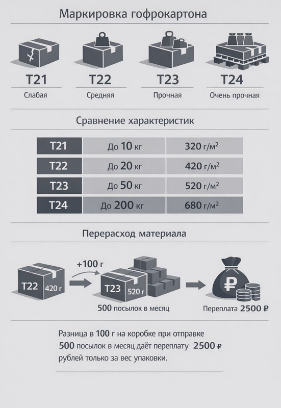 Марка гофрокартона определяет два параметра: прочность и вес. Каждая марка рассчитана на конкретную нагрузку. Использование более прочной марки для легких товаров увеличивает вес упаковки на 30-50%, а это прямая переплата за доставку.